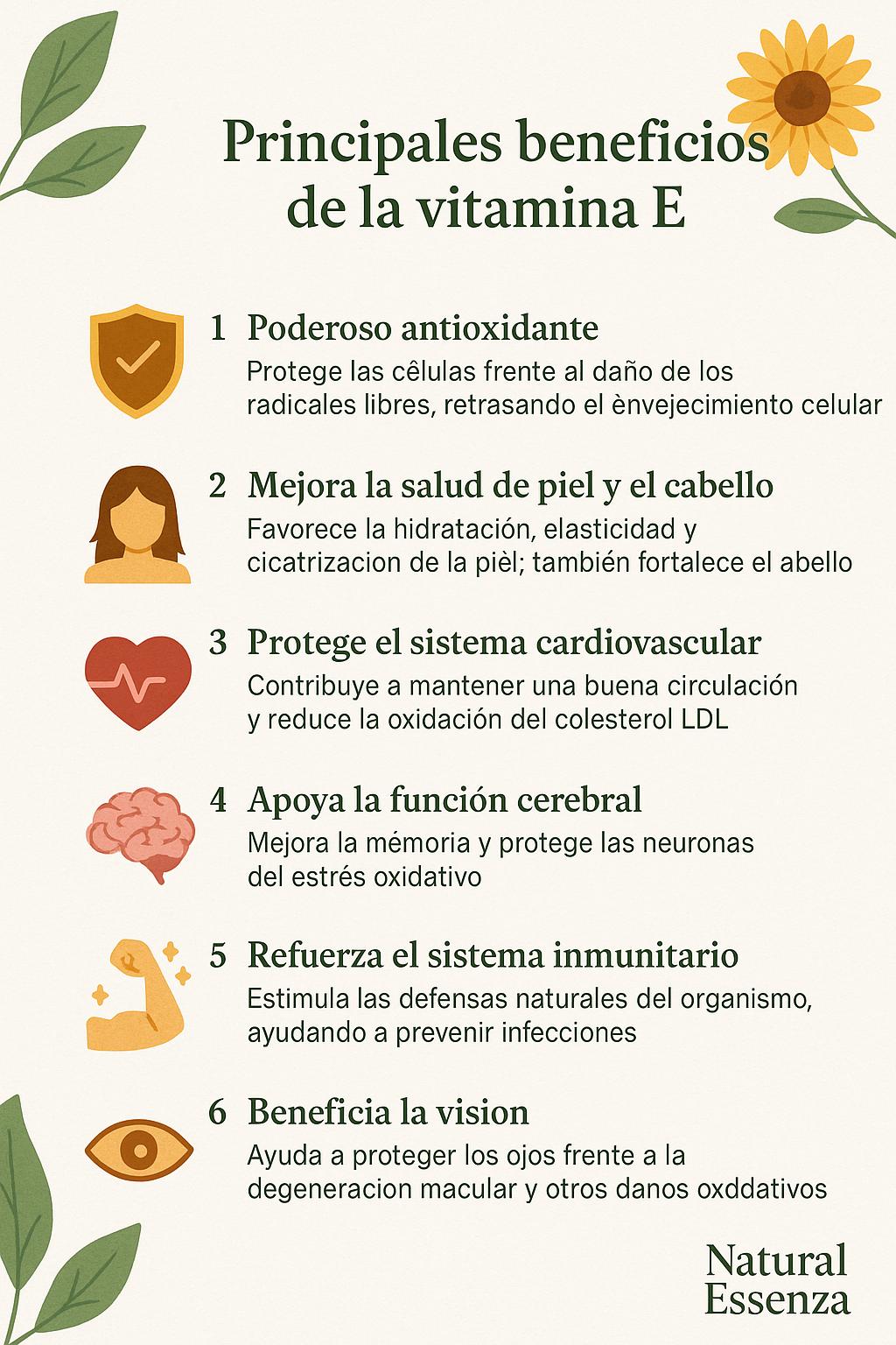 La vitamina E fortalece el sistema inmunológico, protege las células del envejecimiento prematuro y reduce la inflamación.