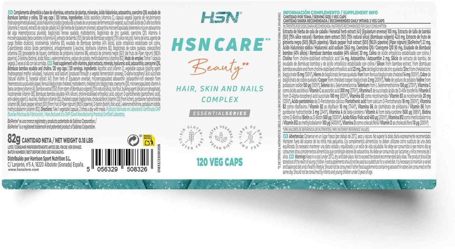 Ácido ascórbico (vitamina C), cápsula vegetal [agente de recubrimiento (hidroxipropilmetilcelulosa)], ácido hialurónico sódico (producido a través de un proceso de fermentación vegetal), succinado ácido de D-alfa-tocoferilo (vitamina E natural), extracto de cola de caballo (4:1, de hierba de Equisetum arvense), astaxantina microencapsulada (oleorresina rica en astaxantina del alga Haematococcus pluvialis), bisglicinato ferroso quelado, maltodextrina, bisglicinato de zinc quelado, coenzima Q10, vitamina A microencapsulada [beta-caroteno (vitamina A)], extracto de bambú (15:1, de tallo de Bambusa vulgaris, 75% sílice natural), harina de arroz, agente de carga (fosfato dicálcico), nicotinamida (vitamina B3), exudado de Bambusa bambos (41% silicio), ácido ortosilícico estabilizado con colina, D-pantotenato cálcico (ácido pantoténico), antiaglomerante (L-leucina), riboflavina (vitamina B2), bisglicinato de cobre quelado, colecalciferol (vitamina D3, procedente de liquen), clorhidrato de piridoxina (vitamina B6), extracto de pimienta negra (50:1, de fruto de Piper nigrum, 98,5% piperina), D-biotina (biotina), ácido fólico, L-seleniometionina, yoduro de potasio, metilcobalamina (vitamina B12).